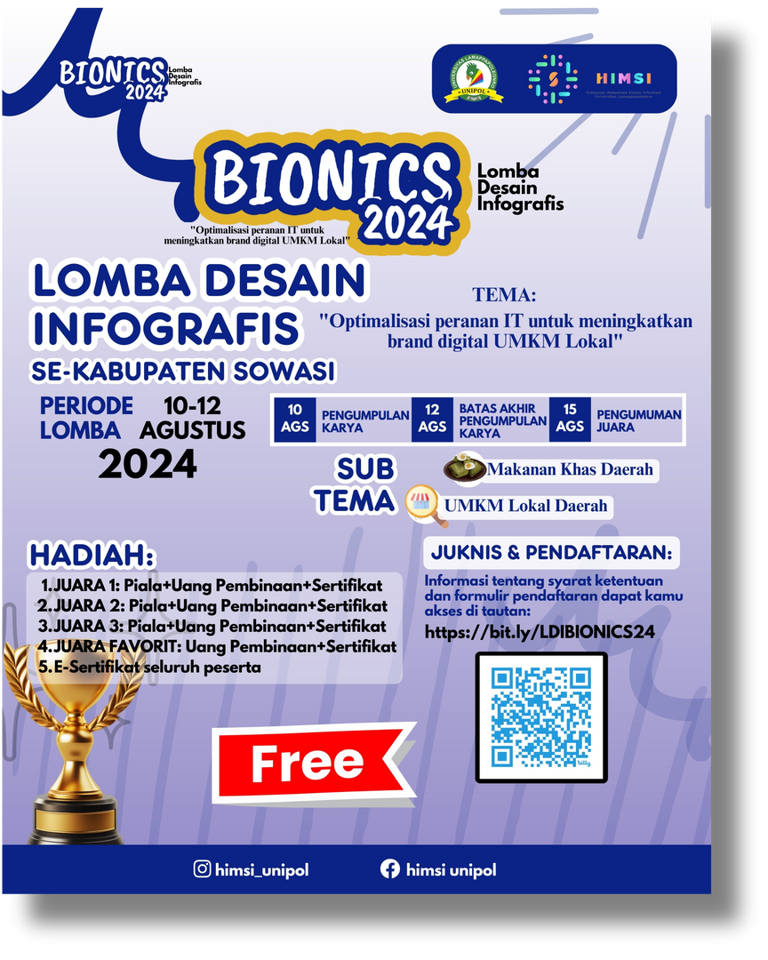 Bionics 2024 adalah inisiatif yang diprakarsai oleh HIMSI UNIPOL periode 2024-2025, bertujuan untuk mengembangkan minat dan bakat siswa di luar akademik melalui seni desain, serta untuk memperkenalkan makanan khas daerah dan mendukung UMKM lokal.